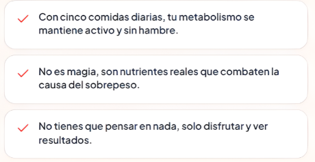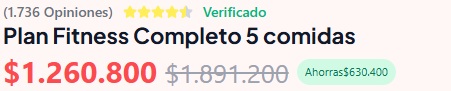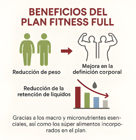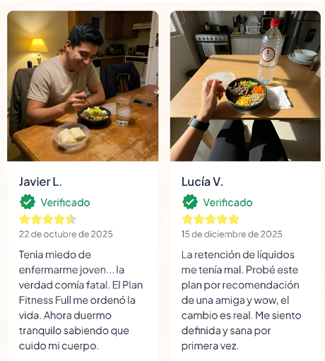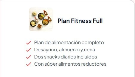 Baja de peso y cuida tu salud futura con nuestro plan de 5 comidas. Portadaportada 2portada 3portada 4Portada 5 Comprar ahora Comprar ahora Comprar ahora Comprar ahora Preguntas frecuentes ¿Y si a mí no me funciona como a los demás?Este plan está basado en nutrición real para resultados sostenibles. No es magia, es darle a tu cuerpo justo lo que necesita. ¿Voy a pasar hambre todo el día?¡Para nada! Con 5 comidas balanceadas, tu metabolismo se activa y te sientes saciado. Se acabaron los antojos por ansiedad. ¿No perderé el peso para luego recuperarlo?Más que una dieta, aprendes a comer. Creas hábitos saludables que se quedan contigo para siempre, evitando justo el efecto rebote. Seguro la comida es súper aburrida y sin sabor, ¿no?¡Te sorprenderá! Descubrirás combinaciones deliciosas que nutren. Comer sano no tiene por qué ser un castigo. ¿Esto es solo para verme bien o de verdad mejora mi salud?Verte bien es la consecuencia de estar sano. Cada ingrediente está pensado para fortalecer tu cuerpo y proteger tu salud a futuro. 1 UNIDADPlan Fitness Full x 20 días$1.260.800 2 UNIDADESPlan Fitness Full x 40 días$2.319.800 3 UNIDADESPlan Fitness Full x 60 días$3.215.000 Ordenar ahora Ordenar Ahora